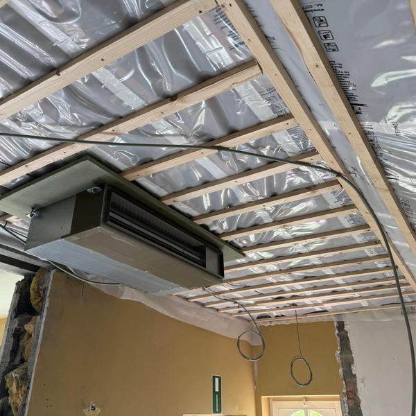 De installatie bestaat uit een LG buitenunit gekoppeld aan LG kanaalunits, verbonden via geïsoleerde luchtkanalen. De lucht wordt onzichtbaar verdeeld via plenum en uitblaasroosters langs de gordijnen, waardoor de temperatuurregeling volledig geruisloos gebeurt. De aanzuiglucht loopt via dezelfde gordijnzones, wat zorgt voor een subtiele luchtcirculatie zonder tocht.